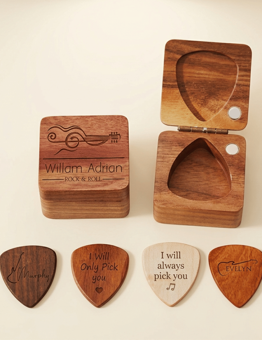 The Virtuoso’s Signature: Hand-Finished Wooden Plectrum & Organiser Set